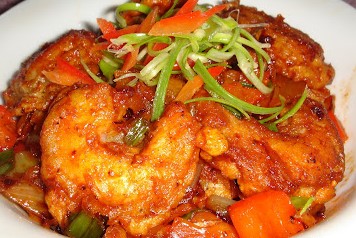3. verhit de olie in de wok of braadpan. Voeg de kruidenpasta toe en stoof dat op matig vuur wat glazig. Voeg de lente ui 2/3 toe en laat 1 minuut al roerend meebakken. Voeg de tomaat, limoensap en garnalen toe en bak ze heel kort 1 minuutje max mee. Blus dit af met kokosmelk en breng op smaak met ketjap asin. Strooi het restant lente ui over het gerecht voor het serveren.