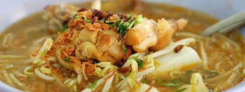 5: Verhit in een wok of grote braadpan de olie, bak de stukken kip in porties daarin al kanten knapperig en goudbruin. Schik de rijst met de kip op een warm bord met een stuk bananenblad.